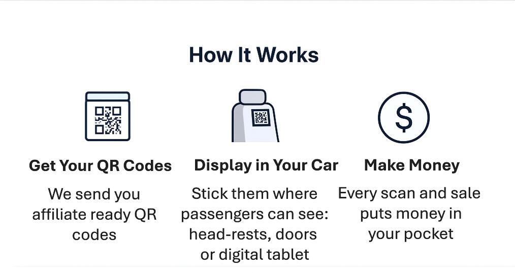 Each QR code links to affiliate offers. When a passenger scans and makes a purchase, we earn a commission — and you get 50% of it. It’s completely passive after setup.Is this allowed by Uber, Lyft, etc.?